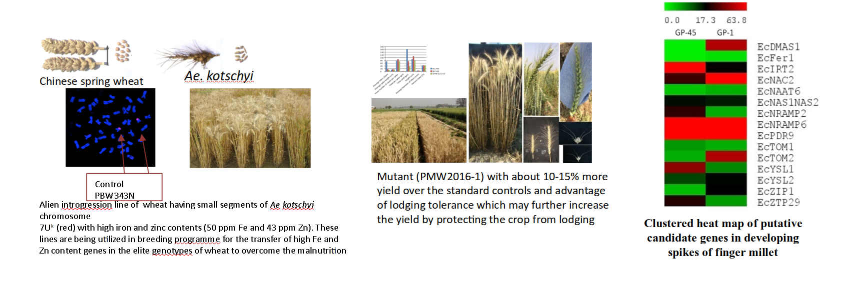 Finger millet, an ethynic crop of Uttarakhand which is rich in nutritionally important proteins and minerals is being utilized to isolate nutritionally important genes and proteins by using transcriptomics and Genotype by Sequencing approaches. These genes/proteins can be utilized for Biofortification of staple food crops and development of value added products. We have isolated the gene encoding prolamin protein and it’s promoter from Finger millet for which a patent has been filed. We have also filed a patent for development of a nanodelivery vehicle using finger millet prolamin for slow and sustained release of fat soluble vitamins so as to increase their bioavailability. Fertilization and Nanotechnological approaches are being utilized to improve these crops in terms of mineral contents. It has been found that nano zinc and nano iron seed priming enhances zinc and iron content in Finger millet seeds and that application of 40 Kg/ha Nitrogen enhances protein quality in terms of essential amino acids.