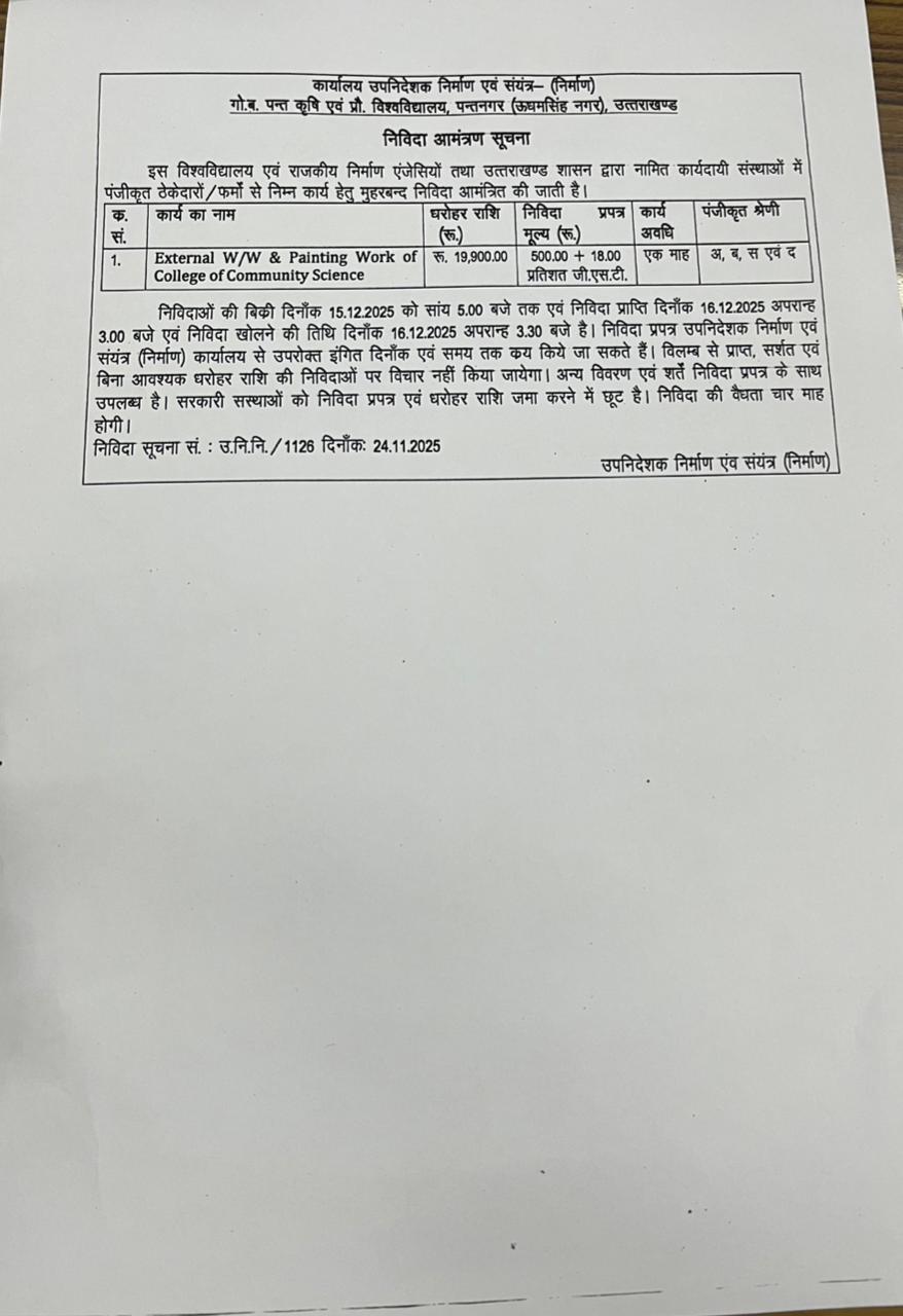 दर सूचना : अस्थायी विद्युत संयोजन हेतु निविदा आमंत्रण (किसान मेला - अक्टूबर 2025) Corrigendum (शुद्धिपत्र)
